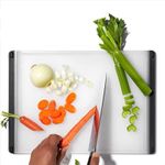 O conjunto de tábua de corte de 2 peças é ótimo para todas as suas necessidades de preparação. Ambas as tábuas de corte têm dupla face para evitar contaminação cruzada e são feitas de polipropileno não poroso e resistente ao odor, que protege contra arranhões profundos e não “cega" as facas.