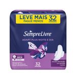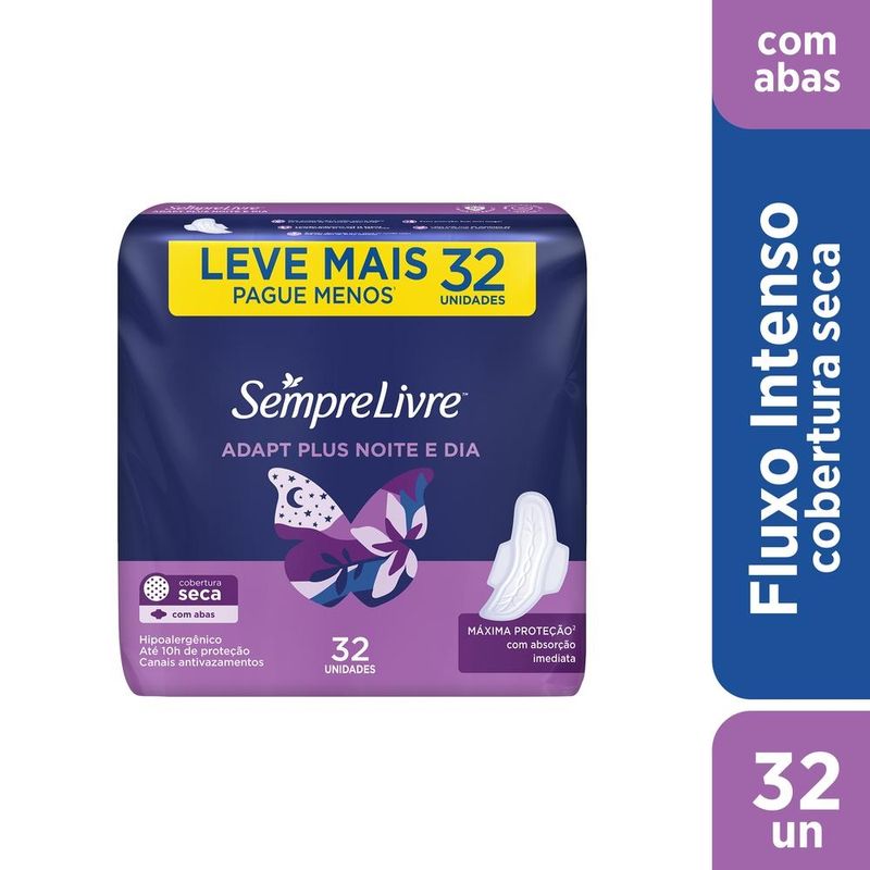 SEMPRE LIVRE® ADAPT PLUS NOITE & DIA possui formato anatômico com maior* área e capacidade de absorção até dos fluxos mais intensos, para o máximo* conforto e proteção por até 10h (*comparado com o portfólio de SEMPRE LIVRE®). Além disso, conta com uma tecnologia exclusiva que neutraliza odores e também possui 70% de ingredientes de origem natural e livre de fragrância e corante.