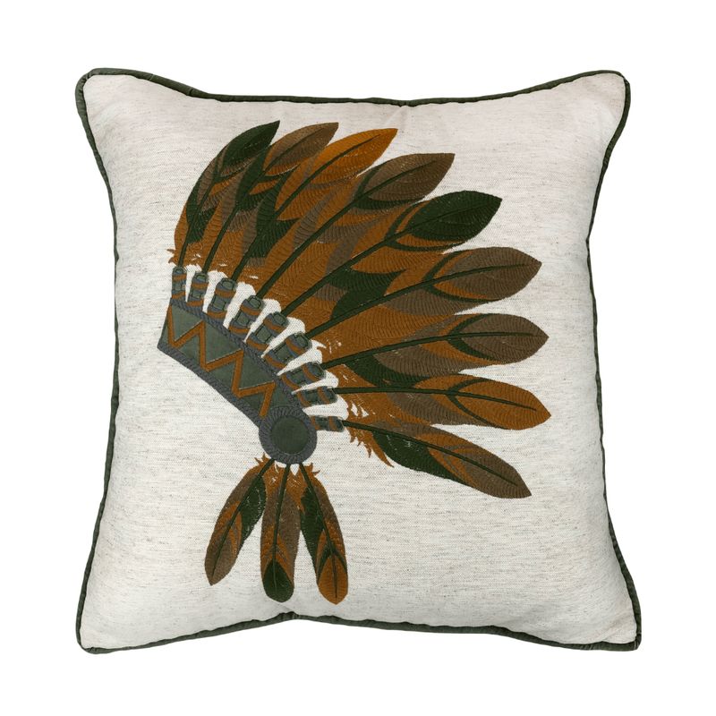 A almofada Linho Cru com Aplicação Bordada traz um toque sofisticado e marcante para a decoração. O design em formato de cocar indígena em tons de verde e marrom valoriza o ambiente com personalidade e estilo único.