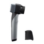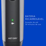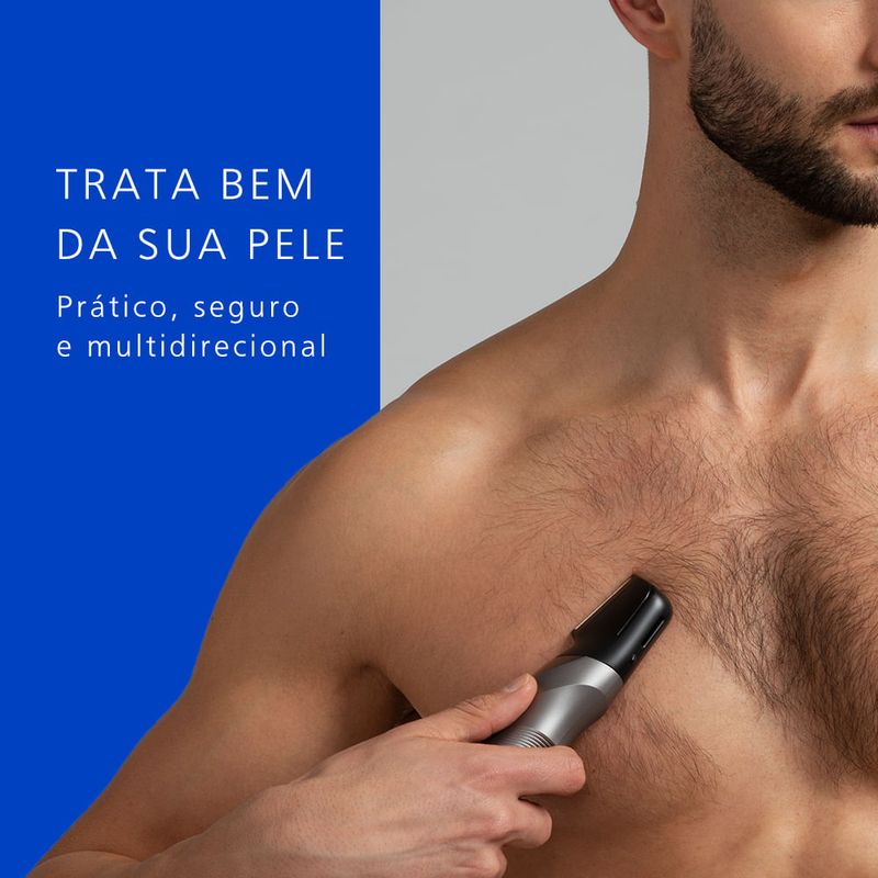 Prático e seguro para a pele, pode ser usado no banho ou a seco, proporcionando conforto. Conta com pente ajustável para diferentes comprimentos e é recarregável.
