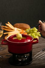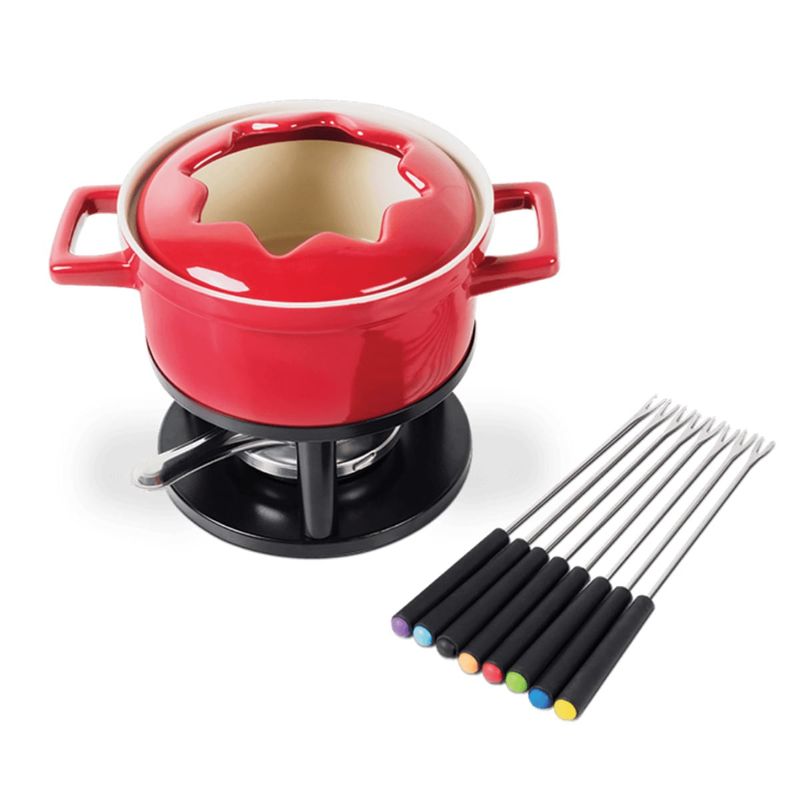 Diferenciais:Bowl em cerâmica de alta qualidade: mantém o calor de forma uniformeCapacidade de 1,28 litros: ideal para servir até 8 pessoasGarfinhos com pontas coloridas: mais praticidade para os convidadosBase metálica estável com suporte e fogareiroDesign sofisticado em vermelho vibrantePerfeito para fondues de queijo e chocolate