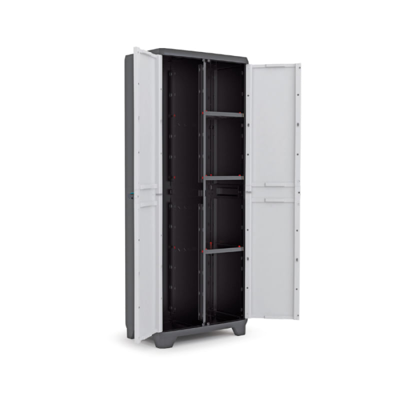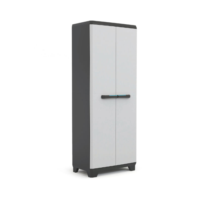Armazenar com estilo nunca foi tão simples - ou tão claro. O Armário Alto Linear possui três prateleiras reguláveis com capacidade de carga de 10kg cada e espaço vertical utilitários para armazenamento de escovas, vassouras e outro objetos maiores. Com alças de toque suave e pés ajustáveis é mais uma solução de armazenamento da Keter, líder mundial em fabricação de móveis de resina. Este gabinete é fácil de montar, fácil de usar e de baixíssima manutenção. O Armário Alto Linear possui portas com trava para maior segurança dos itens que você irá armazenar em seu interior.