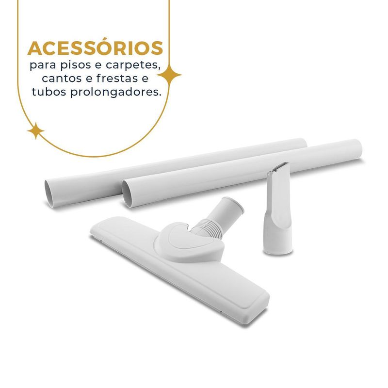 Ainda tem 2 tubos prolongados e saco para pó, permanente e lavável. Para sua maior comodidade, possui rodinhas, que facilitam a locomoção durante a limpeza.