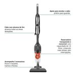 Ele é prático de transportar e possui cordão com alcance de 5 metros, assim, você limpa a casa toda sem precisar ficar trocando de tomada. Compacto, leve e desmontável, o Aspirador é 2 em 1 e você pode utilizá-lo de modo portátil ou vertical, como vassourinha.
