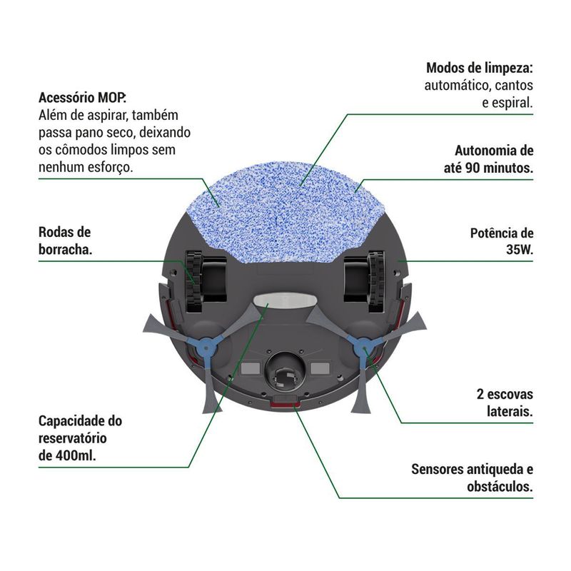 Além de aspirar a sujeira, ele também passa pano, deixando seus pisos impecáveis. Com seu reservatório de 400ml (pó), você garante uma limpeza completa e eficiente em toda a casa.
