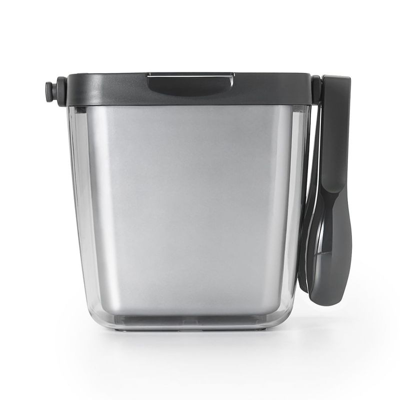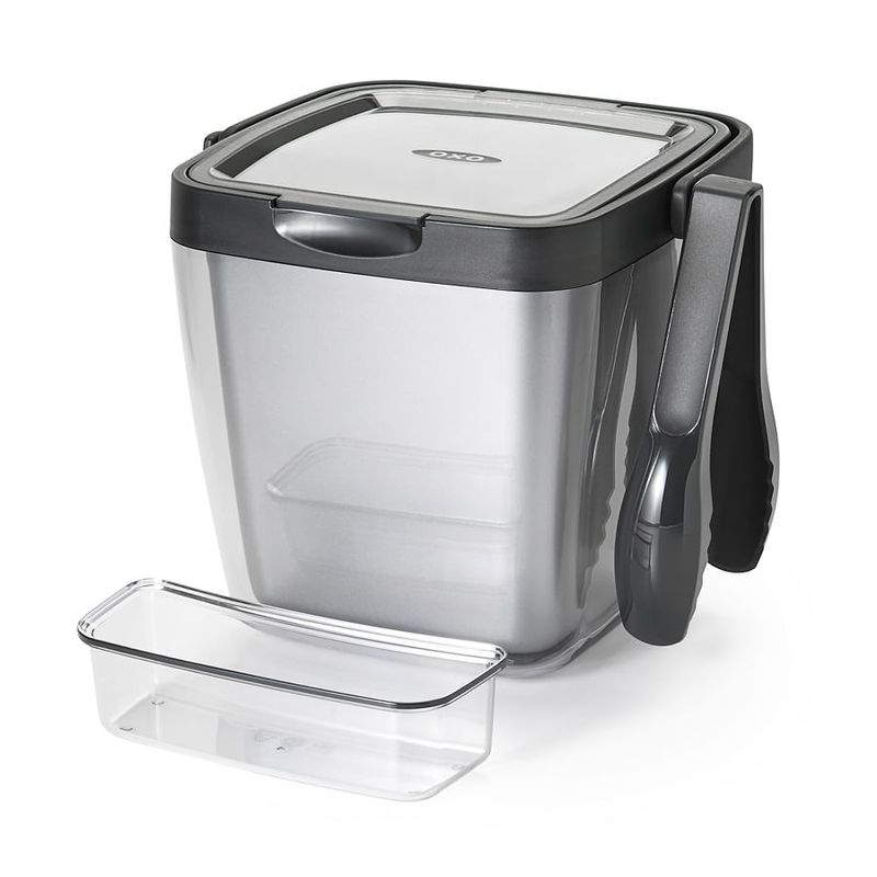 O balde de gelo armazena até 3,1 litros, vem um acompanhamento para colocar guarnições e uma pinça, que pode ser pendurada em ambos dos lados do balde e você ainda pode retirar o compartimento de guarnições do balde para ter mais espaço para os cubos de gelo.