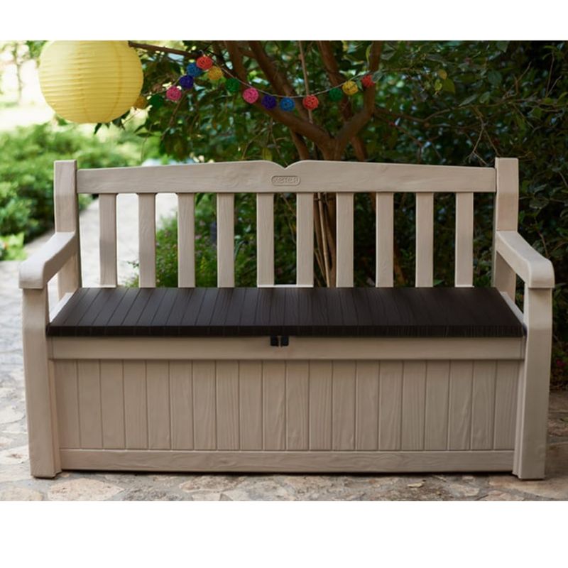 Baú e Banco de Plástico Eden Garden Bench 265L Bege e Marrom Keter com design exclusivo no estilo madeira, ideal para transformar a área externa e armazenar itens como almofadas, cobertores e brinquedos. Fácil de montar e com manutenção zero, não enferruja, não está sujeito a infestação de insetos, não desbota, além de um espaçoso baú é um banco que acomoda confortavelmente até 2 pessoas (peso máximo 210Kg)