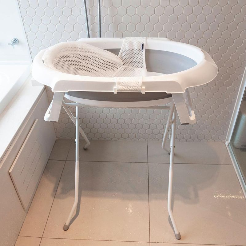 Pés Antiderrapantes e Dobráveis: Os pés da banheira são antiderrapantes, garantindo segurança durante o uso. Além disso, são dobráveis, o que permite que a banheira seja utilizada no chão e facilite o armazenamento.