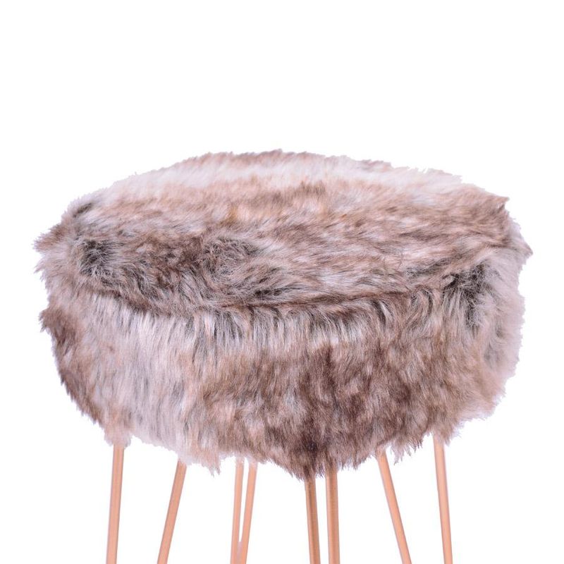 Banquinho Glamour Pelo Mescla Base Metal é composto de Banqueta em espuma revestida em tecido poliéster com base em metal. Seu Altura 40cm Diametro 28 Ø