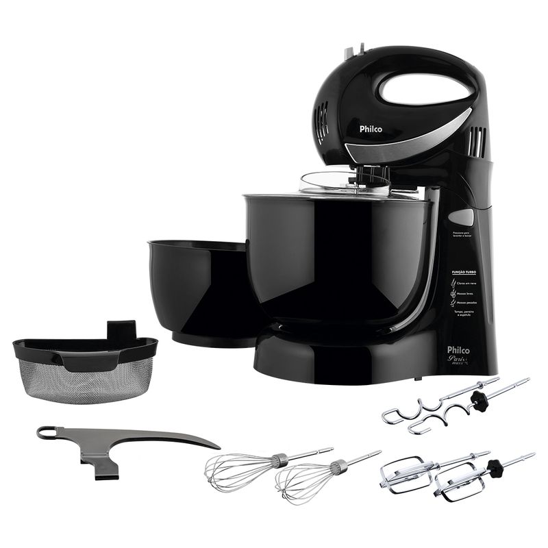 Possui 350W de potência, 4 velocidades e função turbo, garantindo a performance ideal para cada receita. Com 2 tigelas plásticas, uma com capacidade para 4 litros e outra para 3 litros.