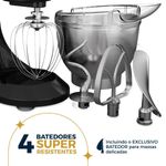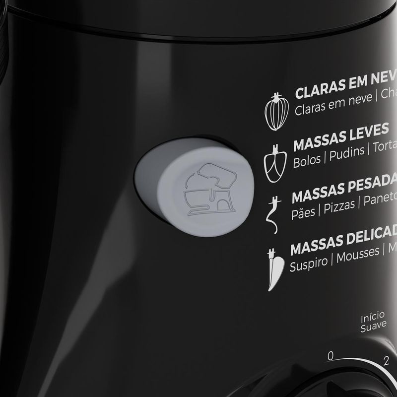 Acompanha três batedores de alto desempenho: um em inox para massas leves, um reforçado para massas pesadas e um em alumínio para claras em neve, tudo pensado para elevar o padrão das suas criações. A unidade é articulável, facilitando o manuseio e a troca dos batedores de forma prática.