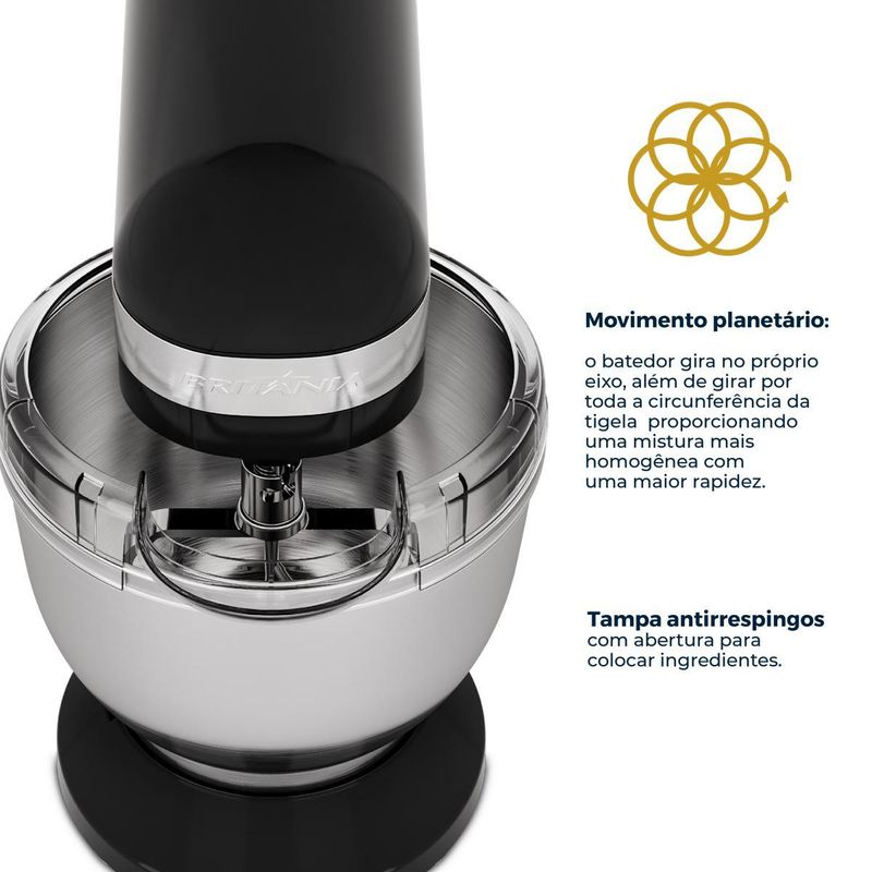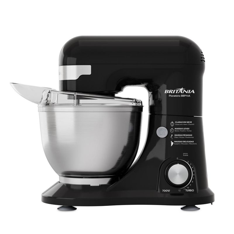 A Batedeira Planetária Britânia BBP70A une desempenho e versatilidade para transformar suas receitas. Equipada com 12 velocidades, função turbo e início suave, adapta-se perfeitamente a cada preparo, da massa mais leve à mais encorpada.