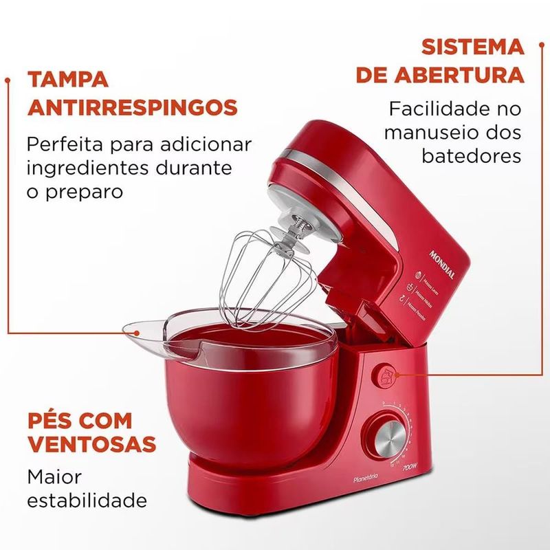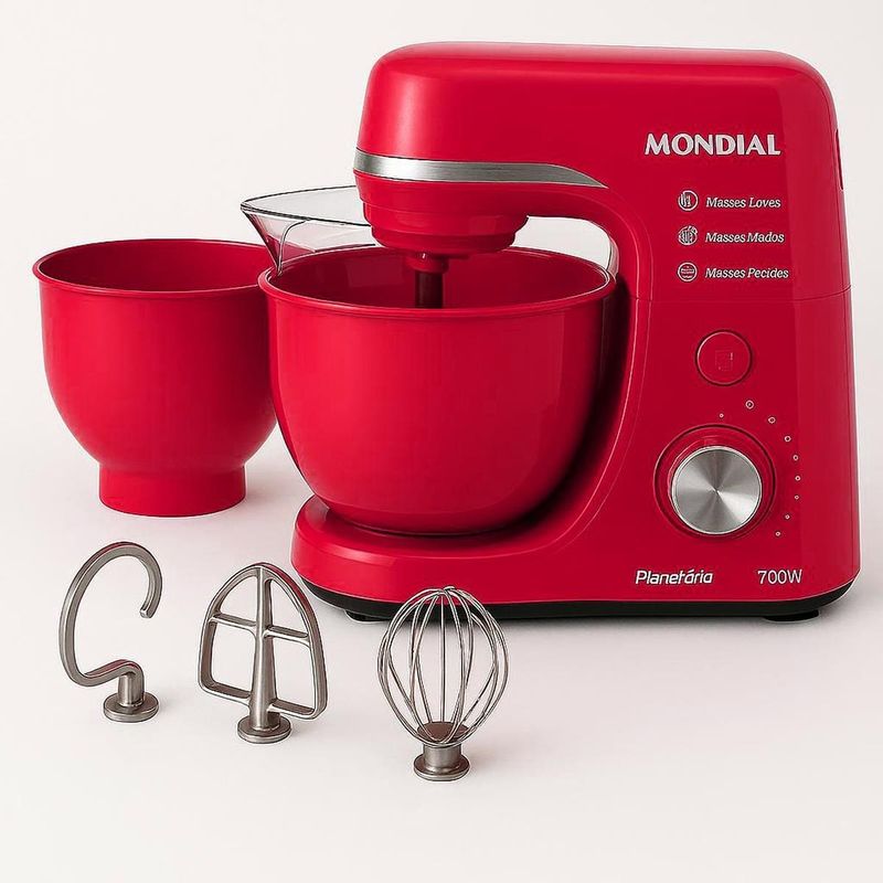 A culinária reúne as pessoas. Refeições feitas com carinho, capricho e aquele sabor único fica mais fácil com a Batedeira Planetária Mondial BP-03-R. O movimento planetário permite mistura muito mais homogêneas do que as batedeiras tradicionais, em curto espaço de tempo. São até 12 velocidades, combinadas com os 700W de potência do modelo Mondial BP-03-R, para atingir o ponto desejado da massa com segurança. Indicada para massas leves, médias e pesadas, como vários tipos de massas, pães, cremes, chantilly e claras de neve.Fácil de manusear, com a Batedeira Planetária Mondial BP-03-R você tem autonomia para usá-la fixa por portátil, ou seja, com a parte superior fora da base. Essa função agiliza o preparo de suas receitas. Completa, possui tampa antirrespingo, perfeita para adicionar ingredientes durante o preparo, evitando respingos e sujeira na cozinha. A Batedeira Planetária Mondial BP-03-R oferece todos os recursos que você precisa.