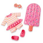Margot vem com um maiô esportivo listrado com babados rosa, óculos de sol florais, sandálias peep-toe e uma boia inflável temática de picolé, que pode ser inflada de verdade, trazendo ainda mais diversão às brincadeiras. Compatível com acessórios e roupas de 46 cm, essa boneca estimula a imaginação, o faz de conta e a criatividade, tornando-se uma companhia perfeita para momentos inesquecíveis.