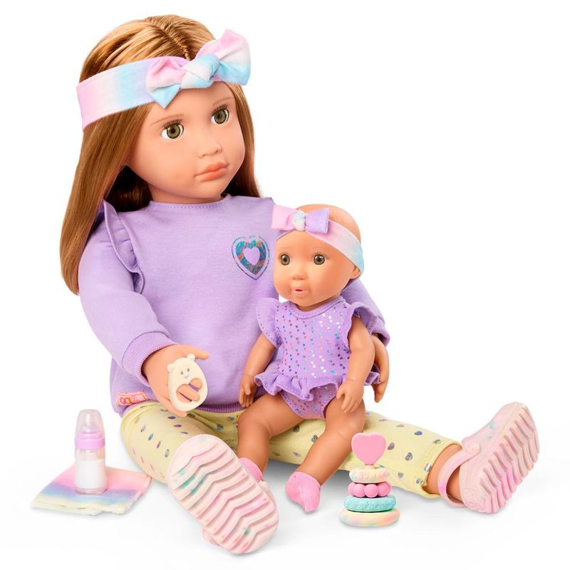 As bonecas Our Generation Tory e Riley são perfeitas para crianças que adoram brincar de cuidar e imaginar histórias cheias de amor. A Tory é a irmã mais velha, sempre pronta para cuidar da pequena Riley, sua adorável irmã bebê. Juntas, elas formam uma dupla encantadora, com roupas combinando em tons pastel e acessórios que tornam a brincadeira ainda mais completa. A Tory vem com uma linda tiara com laço, blusa lilás estilosa com detalhes nos ombros, calça com estampa de corações e sapatinhos. Já a Riley usa um body roxo com babadinhos e uma faixa de cabelo combinando, trazendo ainda mais charme ao conjunto.