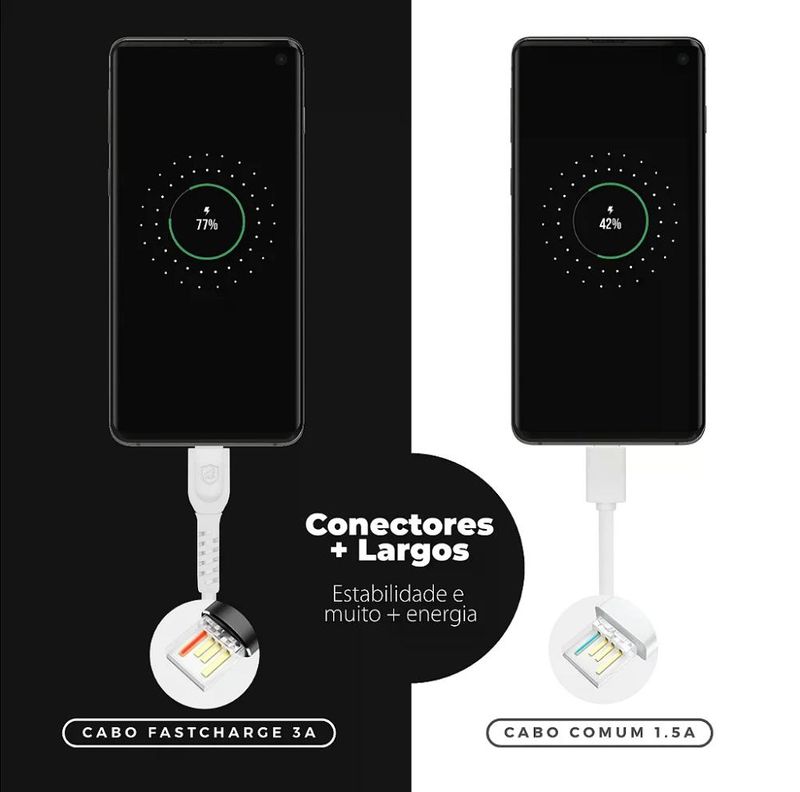 LEIA ANTES DE COMPRAR Atualmente, existem 3 tipos de entrada USB: a Micro USB V8, a Tipo-C (ou Type-C) e a Lightning. É muito importante verificar qual a entrada do seu smartphone antes de comprar um cabo. Atente-se para a diferença entre os modelos! O Lightning é usado SOMENTE pela Apple, ou seja, todo iPhone possui entrada Lightning. O tipo Micro USB V8 é aquele mais tradicional, com um formato que lembra um trapézio (uma base maior e outra base menor). Já oTipo-C (ou Type-C) é simétrico, não possuindo lado diferentes - suas bordas são arredondadas. Qualquer dúvida utilize o campo de perguntas no final da página ou leia as avaliações de outros consumidores. ? DESCRIÇÃO O cabo Dual Shock, da Gorila Shield, possui 1,2m de cabo revestido em PVC reforçado, proporcionando mais resistência e maior durabilidade ao acessório. Para quem possui aparelhos com a tecnologia Qualcomm 3.0, o Dual Shock é compatível. Para guardar o cabo de uma forma mais segura, prenda o acessório com a presilha Smart Arrange. ATENÇÃO: Na hora de usar e guardar o cabo deve-se tomar cuidado para NÃO DOBRAR as pontas do acessório. Ainda que ele seja reforçado, o ato de dobrá-lo com frequência danifica o interior do objeto! Se tiver dúvidas utilize o campo de perguntas no final da página ou leia as avaliações de outros consumidores. ESPECIFICAÇÕES Material: revestimento de PVC reforçado Marca: Gshield Tamanho: 1,2m Cor: Branco Carregamento: Qualcomm 3.0 3A Taxa de transmissão: 480Mbps Corrente: 3A Tensão: 20V Potência: 60W COMPATIBILIDADE Compatível com aparelhos com entrada Type-C GARANTIA 3 meses contra defeitos de fabricação + Garantia Vitalícia Co-Participativa AINDA TEM DÚVIDAS? Use o campo de perguntas no fim da página ou leia as avaliações de outros consumidores. TAGS Cabo USB - Cabo Lightning - Cabo Micro USB V8 - Cabo Tipo-C - iPhone15 * Imagens meramente ilustrativas. Selos, ilustrações ou informações que constam na embalagem podem ser diferentes do produto disponível em estoque.