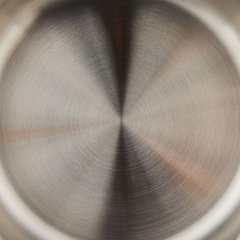 Um disco de alumínio na base é ligado a um interior inox e um exterior inox