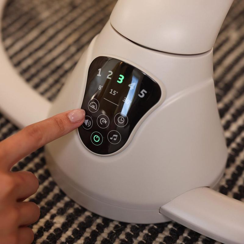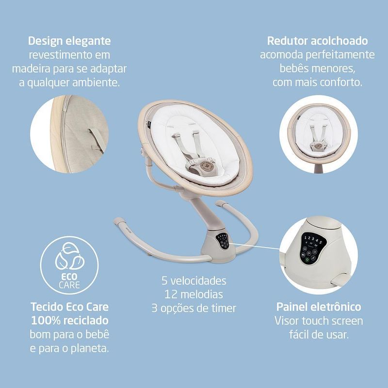 Visor Touchscreen: Fácil de usar, permite controlar as funções da cadeira, como o balanço, a escolha entre 15 melodias relaxantes e o temporizador com 3 opções de tempo.