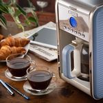 A Cafeteira da Linha Vintage prepara de 4 a 12 xícaras de um delicioso café longo, quente e saboroso. Graças ao timer integrado e ao display LCD, é possível programar o preparo do café para as próximas 24 horas. A placa de suporte da jarra em vidro temperado mantém o café aquecido por cerca de meia hora.