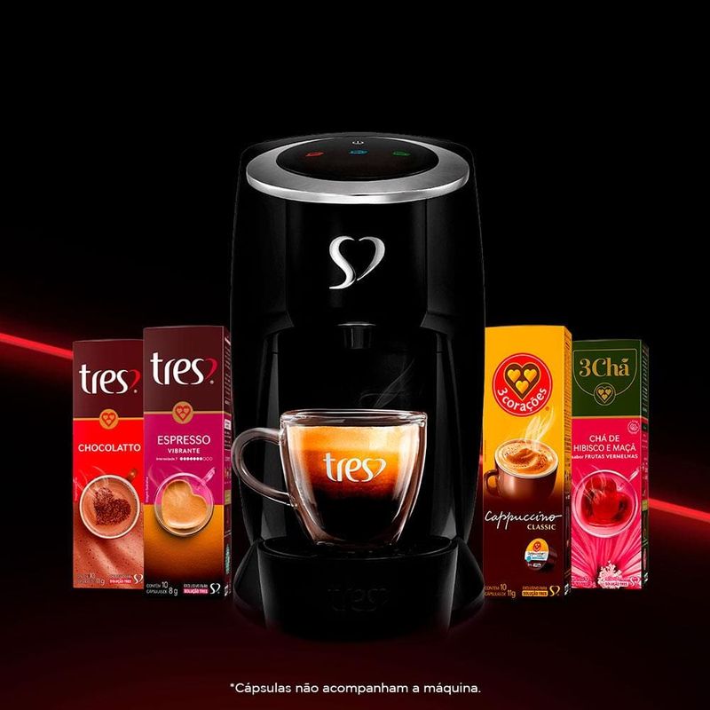 Com a Cafeteira Espresso TRES Touch Automática Multibebidas é possível bebidas cremosas, cafés filtrados e chás naturais ao simples toque de um botão e ainda possui um compartimento interno para até 4 cápsulas usadas e sistema multipressão para garantir praticidade e eficiência no preparo da sua bebida.
