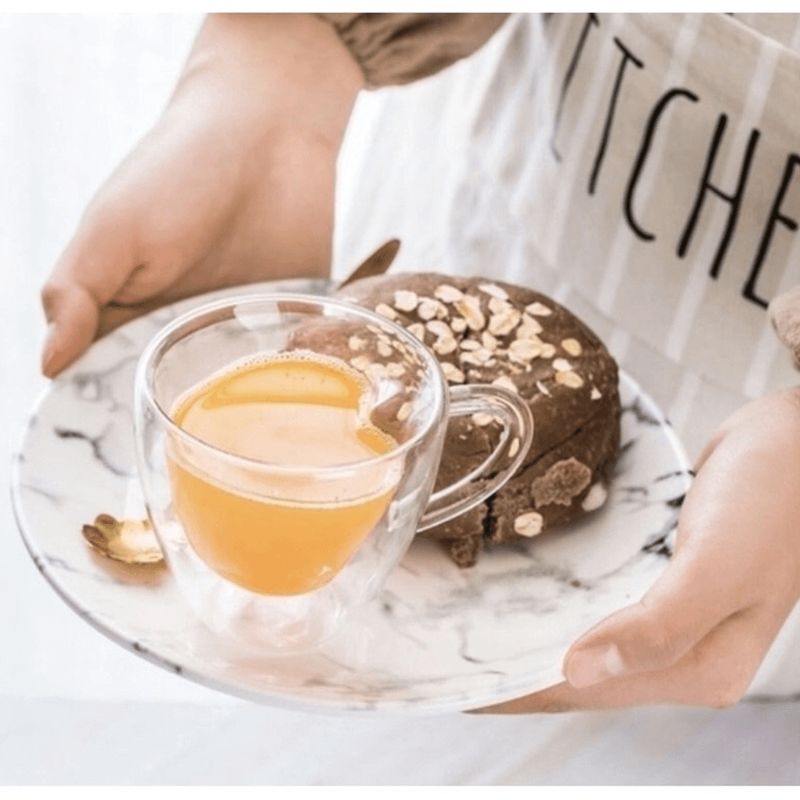 O Design do vidro cria uma ilusão visual, fazendo com que a sua bebida pareça suspensa no ar. Boca suavemente arredonda, sua parede dupla é perfeita para não passar o calor, podendo apreciar sua bebida quente com muito requinte.
