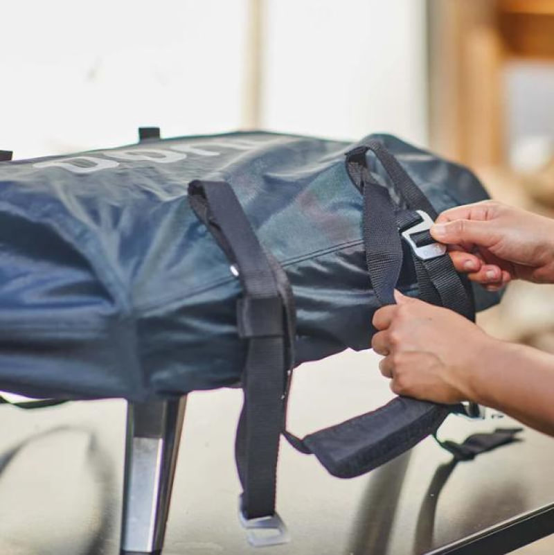 Mova as fivelas de alumínio para ajustar o comprimento da alça de transporte e fixe-as com a alça acolchoada para um transporte confortável.