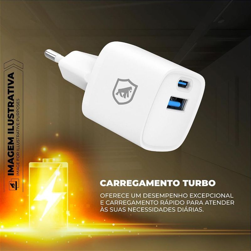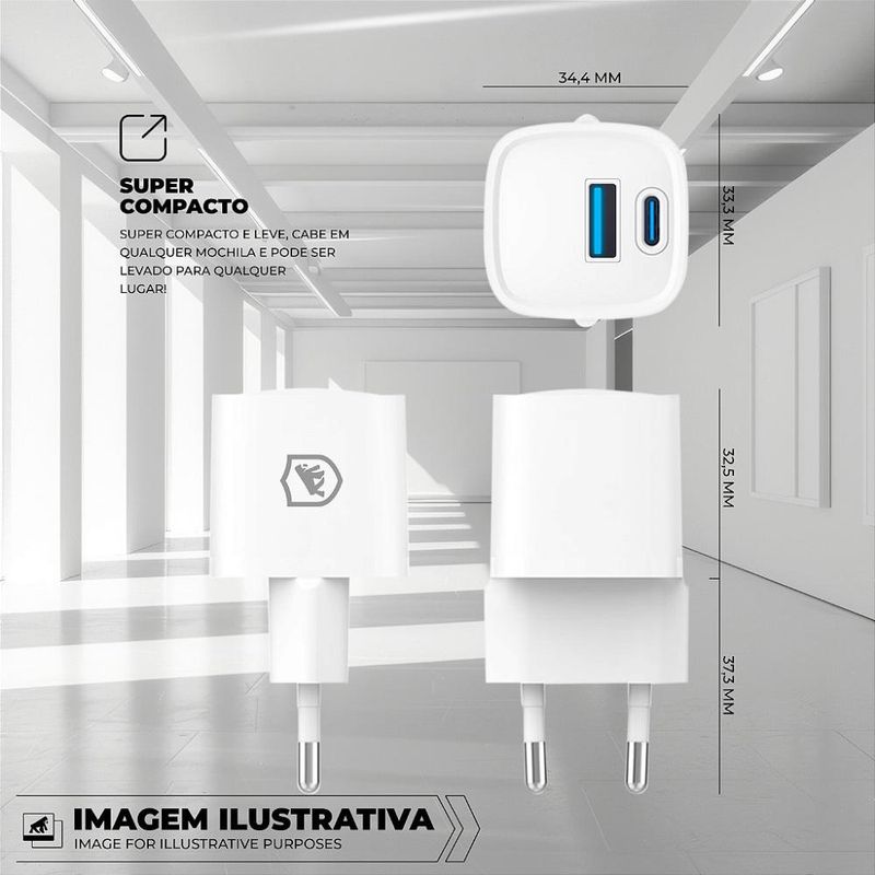 O carregador conta com uma porta Tipo-C com suporte a Power Delivery, proporcionando carregamento acelerado para uma ampla variedade de dispositivos, e uma porta USB-A para carregamento padrão, oferecendo flexibilidade para conectar diversos aparelhos ao mesmo tempo. Com potência de 20W, ele é ideal para carregar rapidamente smartphones, tablets e outros gadgets, mantendo você conectado onde quer que esteja, seja em casa, no escritório ou em trânsito.