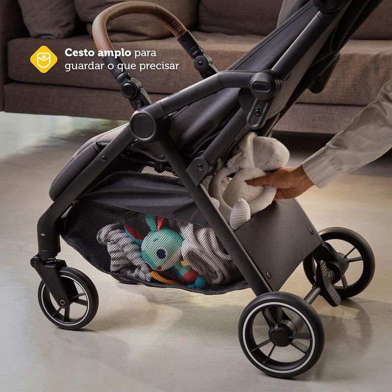 Segurança: Amortecedores nas quatro rodas, cinto de 5 pontos ajustável em largura e altura.