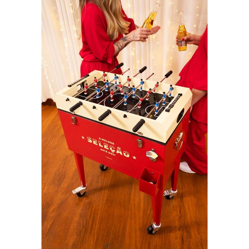 Sendo um verdadeiro 2 em 1, em sua parte superior, ele conta com um jogo de pebolim para você se divertir com a família ou com os amigos, já em sua parte interna, ele é o cooler perfeito para você armazenar suas bebidas e mantê-las sempre na temperatura certa!