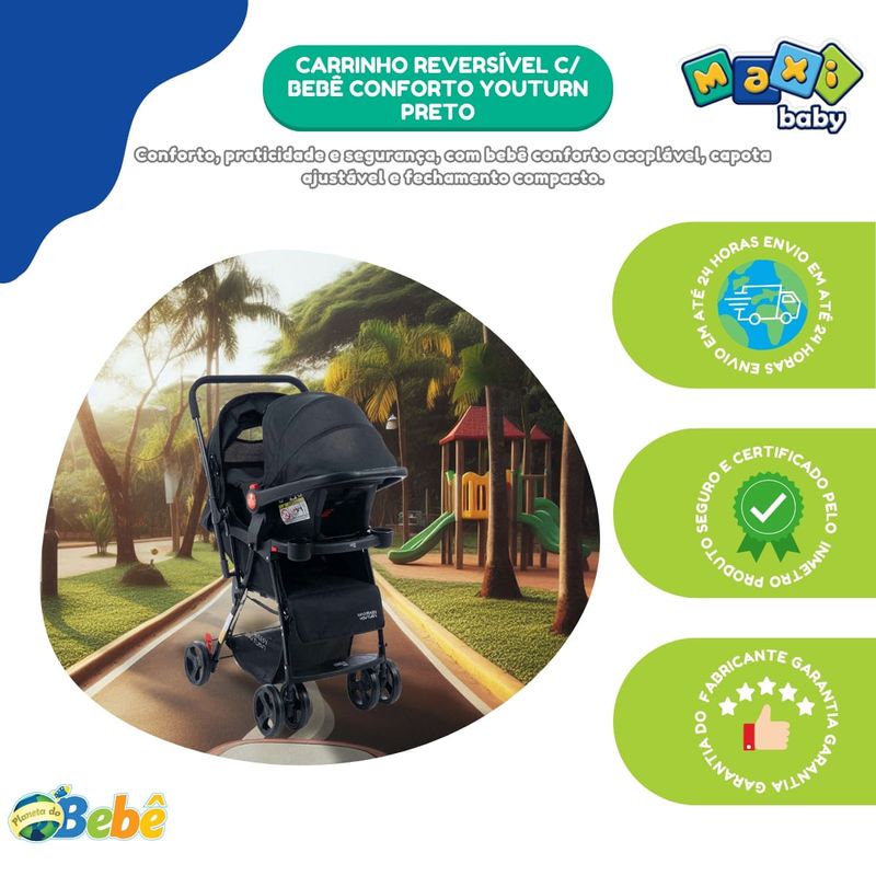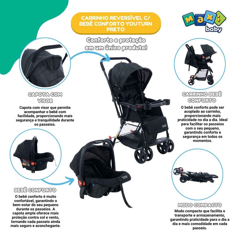 O Kit Carrinho de Bebê com Bebê Conforto Travel System Youturn Maxi Baby é a solução perfeita para pais que buscam praticidade, conforto e segurança em todos os momentos com seus pequenos.