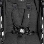 Cinto de segurança de 5 pontos com protetores acolchoados e ajuste de altura e largura.