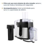 Com o sistema de alta rotação e 800W de potência é possível extrair o suco de frutas e hortaliças em segundos.