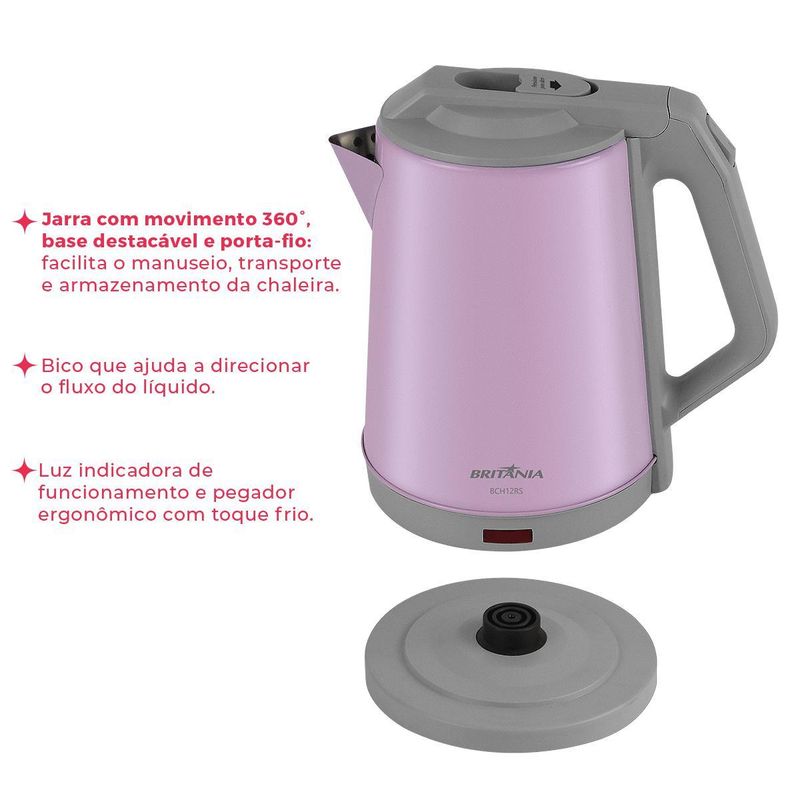 Sua água fervida em poucos minutinhos! A Chaleira Elétrica Rosa Britânia 1,9L Inox BCH12RS é ideal para quem não quer perder tempo! Com 1,9L de capacidade, ela é a medida exata para o preparo de chás, água para cafés, aquele delicioso chimarrão e para agilizar no preparo de diversos alimentos.