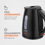 Estilosa, na cor preta, possui botão de abertura automática na tampa, filtro coador, alça resistente e a jarra removível é sem fio, permitindo maior mobilidade e segurança enquanto você prepara seu chá, sopas instantâneas ou aquele agradável café da manhã direto na mesa. A lâmpada piloto indica o funcionamento do produto e quando alcança a fervura, ela apaga com o desligamento automático. Simplificando sua vida na cozinha, com porta-fio, leva maior praticidade na hora de guardar após o uso.