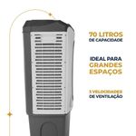 Com capacidade para 70 litros, ele é ideal para grandes ambientes, como salas, escritórios, lojas ou áreas externas cobertas, e funciona por mais tempo sem a necessidade de reposição frequente de água. É possível escolher entre 3 velocidades de ventilação e ajustar a intensidade conforme sua necessidade.