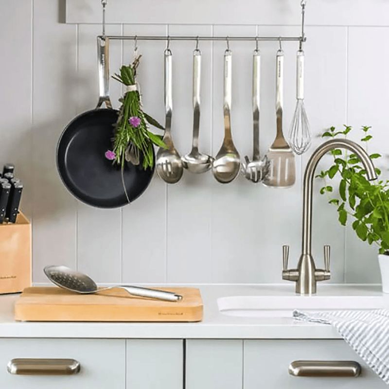 Durável para o uso diário, esta colher de alinhavo de aço inoxidável Premium da KitchenAid é essencial na cozinha. Habilmente projetada em aço inoxidável polido, esta colher para regar (ou colher para cozinhar, como também é conhecida) tem uma aparência elegante e moderna, enquanto o design ergonômico do cabo oferece controle ideal e uma pegada confortável. Use esta colher de metal sólido KitchenAid para mexer, colher e servir alimentos facilmente. Resistente à ferrugem e ao calor até 260 ° C, esta colher de metal para alinhavar da KitchenAid também pode ser lavada na máquina de lavar louça para facilitar a limpeza. Mantenha esta colher de metal sempre à mão graças ao gancho pendurado na extremidade do cabo.