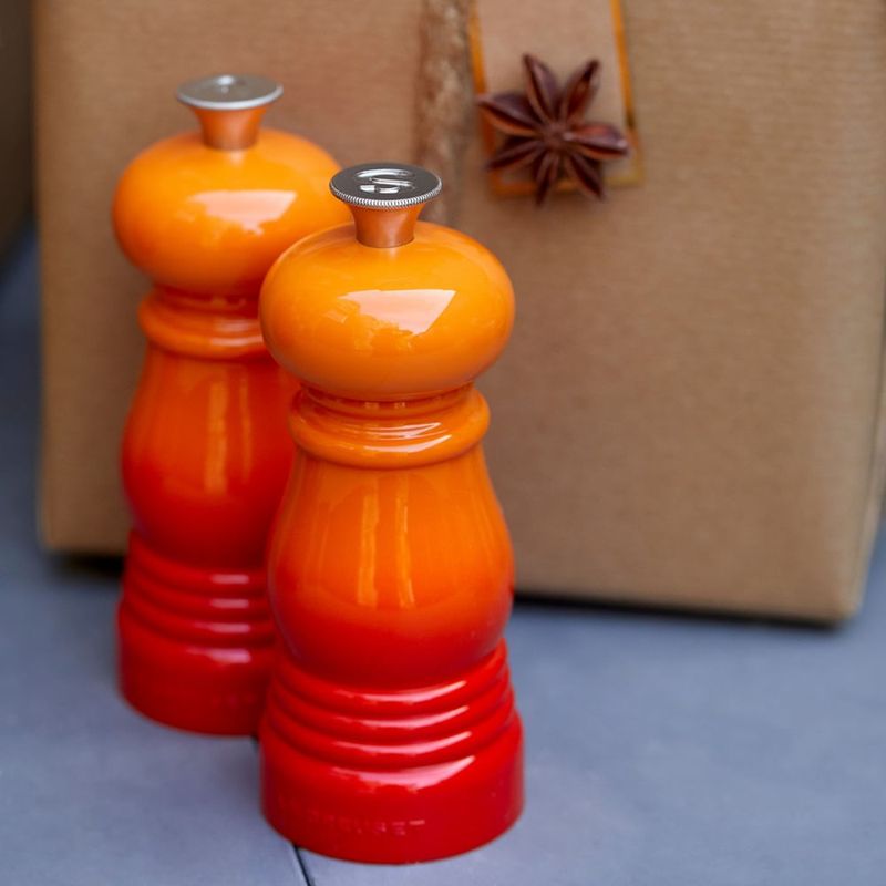 O conjunto Moedores Pimenta & Sal Le Creuset combinam a forma clássica e a tecnologia moderna com nossas cores icônicas. Além de elegantes nossos moedores de Sal e Pimenta são fabricados em Plástico ABS, material ultra resistente. O ajuste de moagem é feito por meio de um pino localizado no topo da peça onde é possível determinar a espessura do condimento.