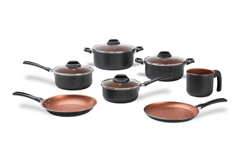 O conjunto contém:1 Caçarola com tampa Ø22 cm – 3,45 L1 Caçarola com tampa Ø20 cm – 2,6 L1 Panela com tampa Ø18 cm – 1,9 L1 Panela com tampa Ø16 cm – 1,3 L1 Frigideira Ø22 cm – 800 ml1 Tapioqueira Ø22 cm – 590 ml1 Fervedor Ø12 cm – 1,25 L