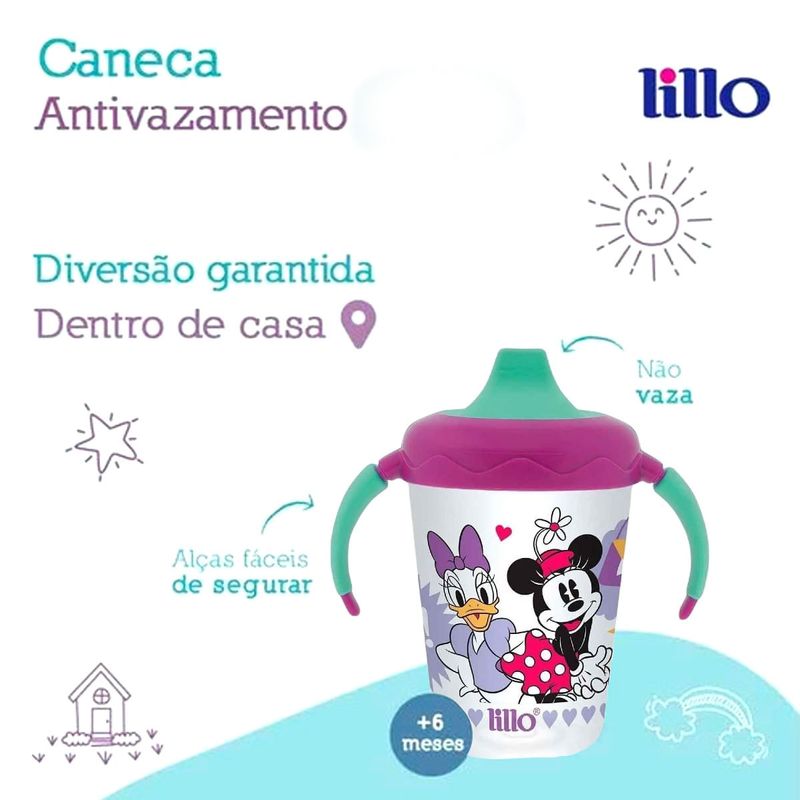 A Caneca Antivazamento Disney Lillo é recomendada para crianças que começam a ingerir líquidos de forma independente. Colaborando para que o processo de transição da mamadeira para a caneca ocorra naturalmente.