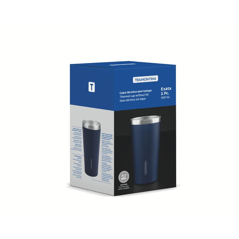 O copo térmico Tramontina Exata em aço inox com parede dupla azul sem tampa 420 ml é a escolha ideal para curtir momentos especiais com os amigos e na companhia da sua bebida preferida. Desenvolvido em aço inox com parede dupla e acabamento térmico, ele mantém a temperatura adequada sendo elas frias ou quentes, é livre de BPA, não mancha, é fácil de limpar e não retém odores. O copo não transmite sua temperatura para a parte externa e garante além da sua bebida gelada por mais tempo, muito estilo para todos os seus momentos!