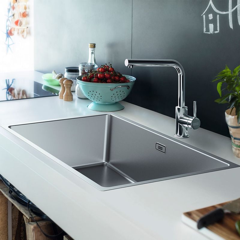 Os cantos retos das novas cubas Línea Franke dão um toque de modernidade e imponência em qualquer cozinha.