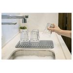 O Escorredor De Copos Trium possui ranhuras que diminuem o contato direto dos copos com a superfície, evitando o embaçamento dos vidros e escoando rapidamente a água. Seu design foi pensado para direcionar o fluxo da água para a cuba, evitando que ela se espalhe na pia. O escorredor possui capacidade para seis copos ao mesmo tempo, mas também possibilita o uso com taças, bowls, tigelas e outros.