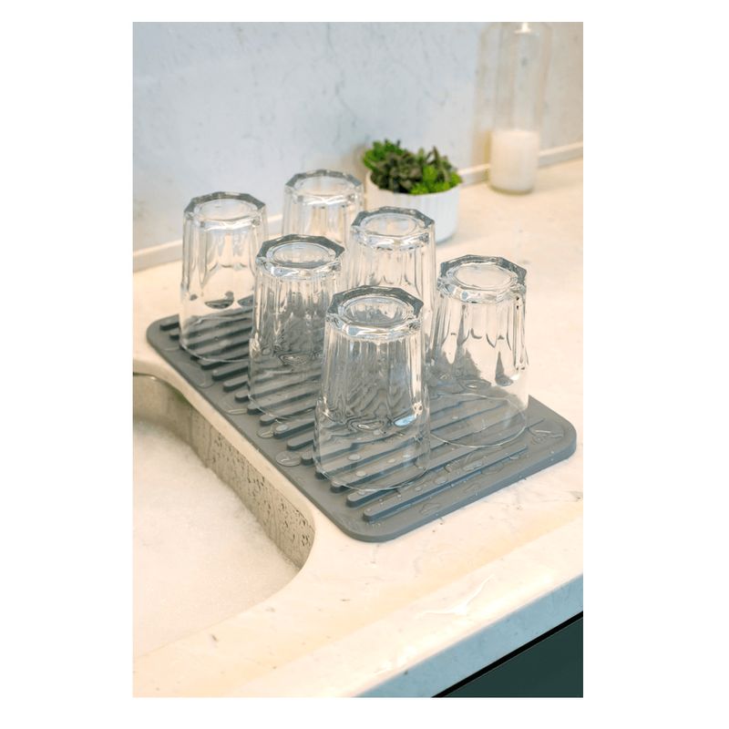 O Escorredor De Copos Trium possui ranhuras que diminuem o contato direto dos copos com a superfície, evitando o embaçamento dos vidros e escoando rapidamente a água. Seu design foi pensado para direcionar o fluxo da água para a cuba, evitando que ela se espalhe na pia. O escorredor possui capacidade para seis copos ao mesmo tempo, mas também possibilita o uso com taças, bowls, tigelas e outros.