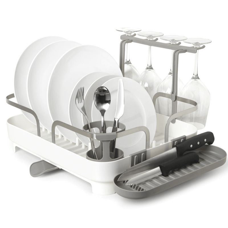 O Escorredor de Louça Umbra Holster Cinza tem capacidade para 15 pratos, bandeja lateral multifuncional com organizador de facas, bico de drenagem de posição dupla, suporte para utensílios e porta-taças portátil. Todas as peças são customizáveis. Você pode encaixá-las de acordo com sua preferência.