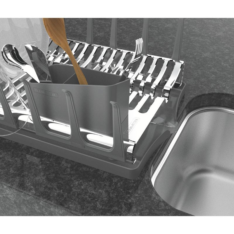 O escorredor de louça em aço inox com bandeja coletora grafite da linha Plurale vai facilitar o seu dia a dia, além de decorar, colorir e dar personalidade à sua cozinha. Esta peça possui pés de silicone que evitam que ela escorregue, além das funções: Coletora para proteger superfícies e mantê-las secas. Direcionadora que escoa a água para dentro da pia e elimina o excesso na bancada e multiuso para que quando a bandeja é usada separada, funcione como um escorredor para louças auxiliar. Esse item é completo e a sua cozinha não pode ficar sem. É possível acomodar 16 pratos e 12 copos, além de talheres e outros utensílios.