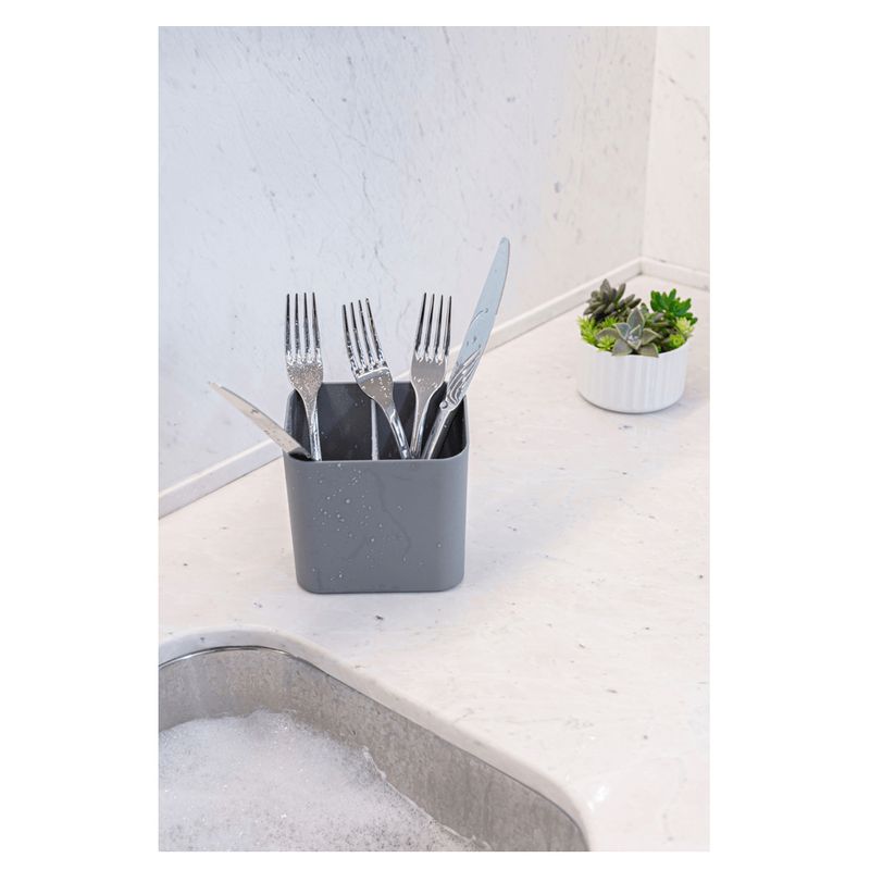 O escorredor possui reservatório interno evitando que a água escorra sobre a pia. Além de divisória interna ser removível, não deixando os itens armazenados terem contato com a água. Fabricado em material resistente e flexível (Polipropileno), além do plástico ser texturizado reduzindo riscos e facilitando a higiene.