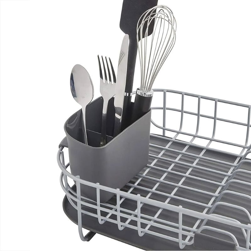 A cremalheira de arame é feita de aço carbono; porta-utensílios e bandeja são feitos de plástico.