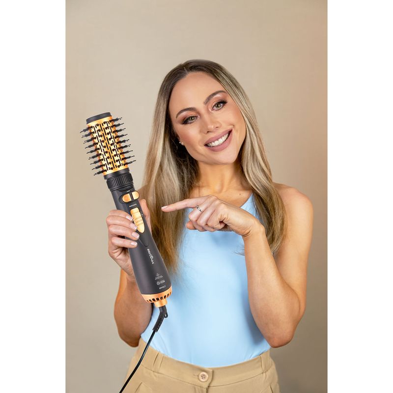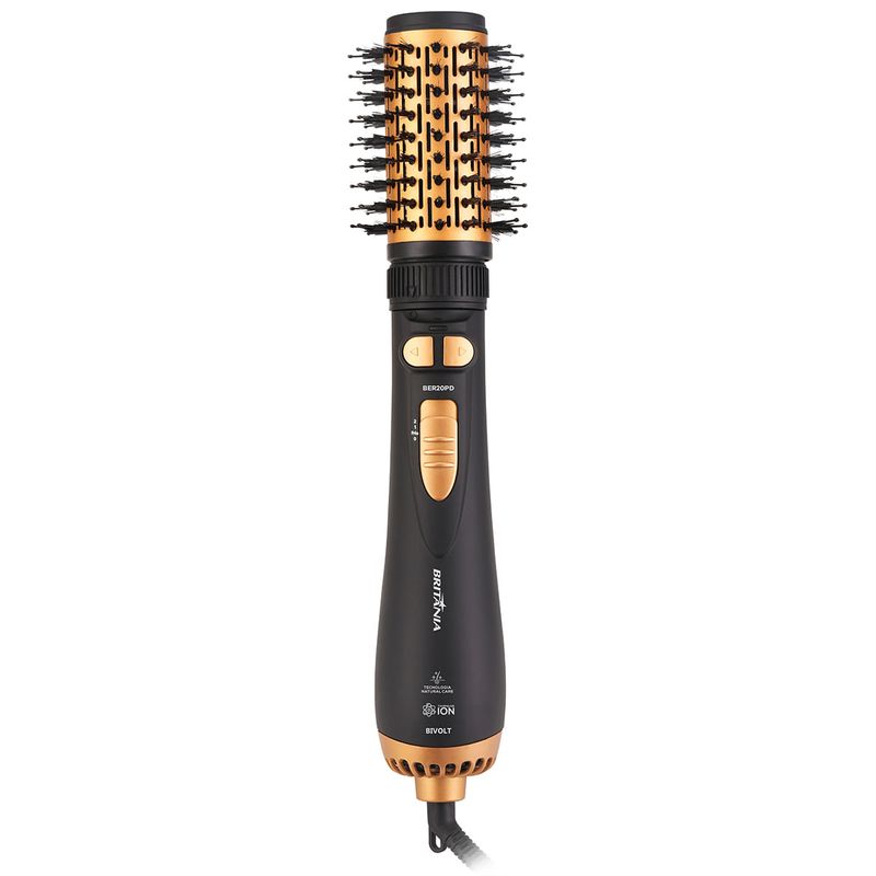 Mais saúde para seu cabelo e praticidade para seu dia a dia com a Escova Rotativa Britânia BER20PD 4 em 1 3 Temperaturas Bivolt. O Revestimento Gold da escova rotativa evita o ressecamento e atrito com o cabelo, pois contém nanopartículas de cerâmica e protege os fios, o que garante mais movimento, maciez e brilho. Tenha em casa a melhor escova rotativa, pois com ela você finaliza seus penteados preferidos, ao utilizar das 3 temperaturas, duas velocidades e dois sentidos de rotação. Ela é perfeita para você! A escova rotativa é 4 em 1: seca, alisa, escova e dá volume aos seus cabelos, além de ser bivolt, possui cordão giratório com 360 graus e de 1,80m de comprimento e alça para facilitar o armazenamento dela. Tenha a Escova Rotativa Britânia BER20PD 4 em 1 3 Temperaturas Bivolt e esteja sempre pronta para todo tipo de ocasião, com inovação e agilidade.