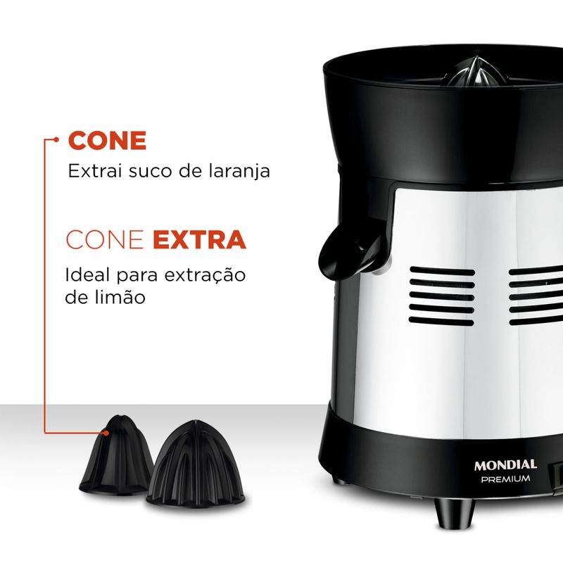 2 CONES PARA EXTRAÇÃO: O cone maior é ideal para preparar sucos de laranja. Acompanha cone extra para frutas menores, como limão.