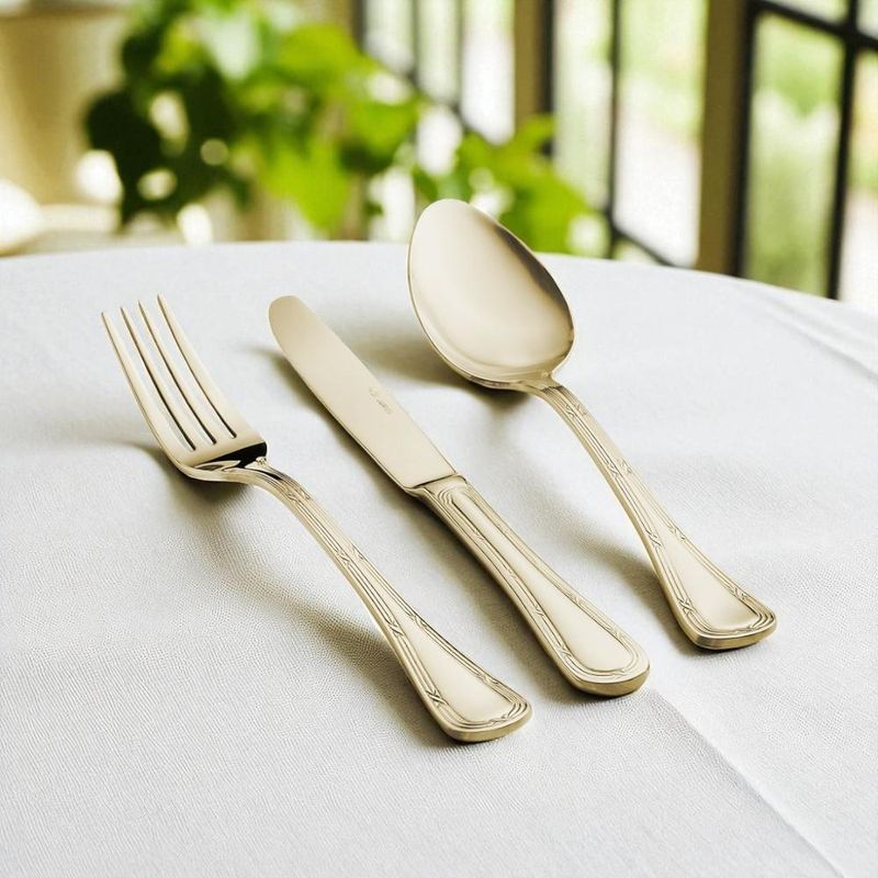 O design Lace Champagne Gold o diferencia, apresentando um padrão delicado que lembra uma renda, com um acabamento em tons dourados que adicionam um toque de requinte. Esta combinação do brilho do aço com o calor dos detalhes dourados cria um visual único e sofisticado, que se adapta a diferentes estilos de pratos e decorações. As facas, em particular, possuem uma característica que adiciona uma sensação de solidez ao manuseio e contribui para a durabilidade do talher. É um faqueiro que exala bom gosto em cada detalhe, elevando a apresentação de qualquer refeição.